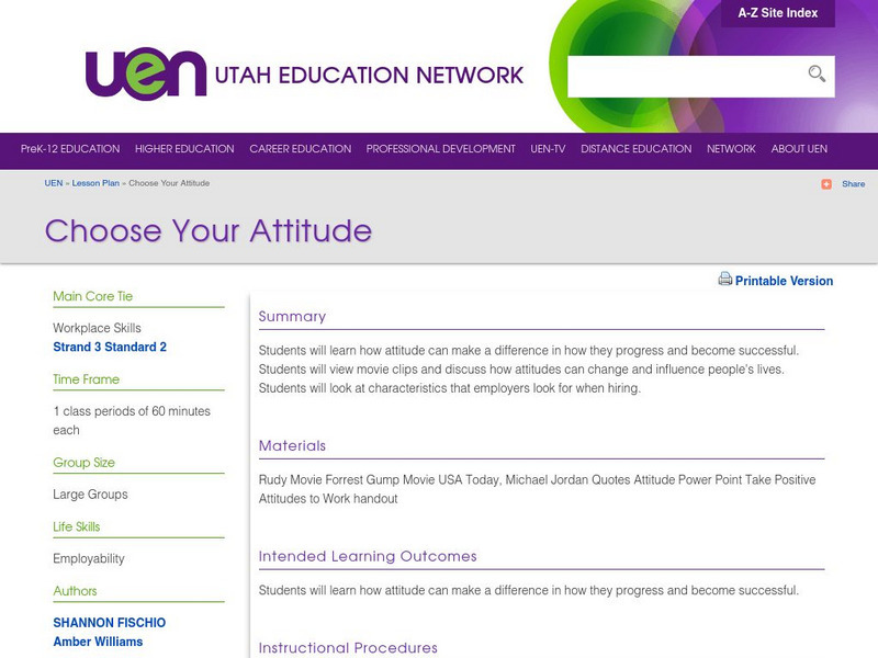This lesson engages students in determining the importance of attitudes on many facets of life. Students will view movie clips, view PowerPoint presentations, discuss how attitudes can change and influence people's lives, and look at...