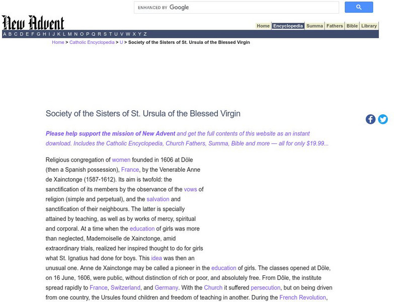 This is the history of the Society of the Sisters of St. Ursula of the Blessed Virgin, a religious order of women, often referred to as the Ursuline Sisters. Please note that ?The Catholic Encyclopedia? is a historic reference source and...