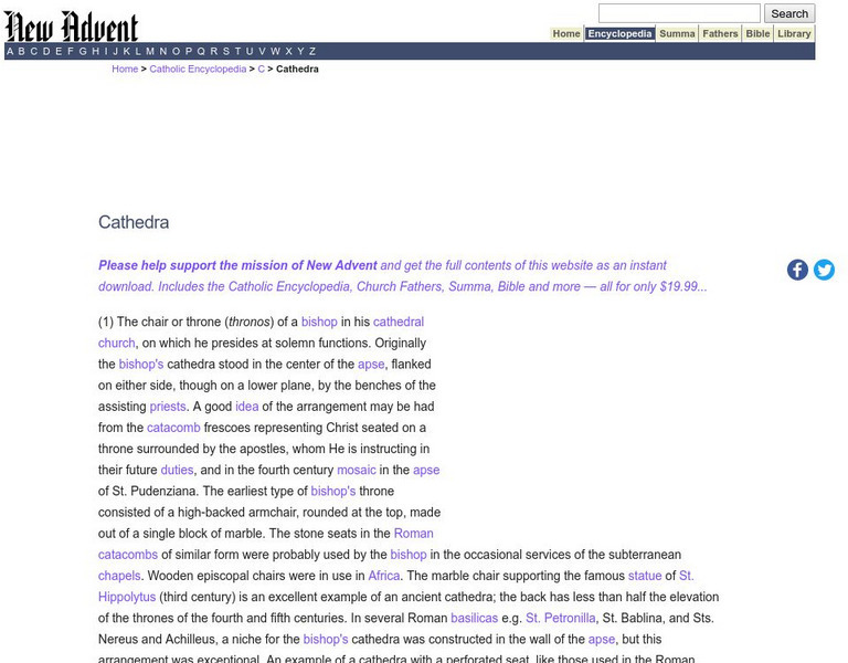 This article looks at the cathedra, or throne, that is symbolic of the Bishop's role of leadership in the Roman Catholic Church. This site includes links to sites with related information. Please note that ?The Catholic Encyclopedia? is...