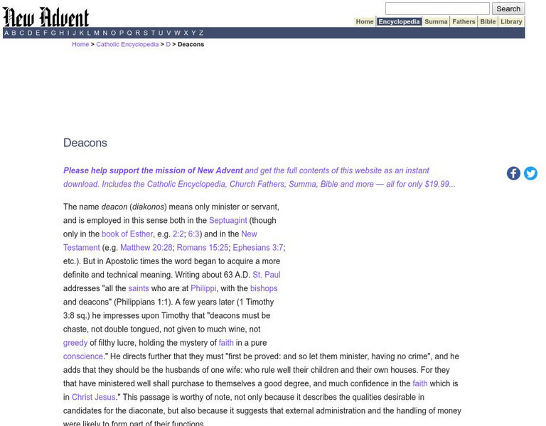 This article looks at the origins, history and liturgical role of the deacon in the Roman Catholic Church. This site includes links to sites with related information. Please note that ?The Catholic Encyclopedia? is a historic reference...
