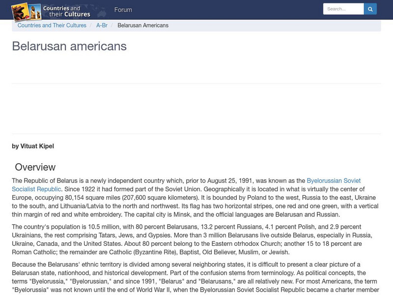 Provides an overview of the traditional culture and lifestyle of Belarusan Americans. (Note: Content is not the most current.)