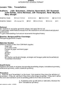 Students create an art piece incorporating tessellating shapes, translational symmetry, reflectional symmetry,and or rotational symmetry. They are asked if they know the definition of tessellation. If so, students are asked what shapes...