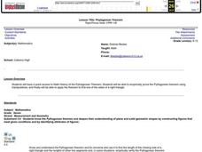 Learners investigate the Pythagorean Theorem. In this seventh through twelfth grade geometery lesson, students explore the Pythagorean Theorem and its converse and use it to find the length of the missing side of a right...