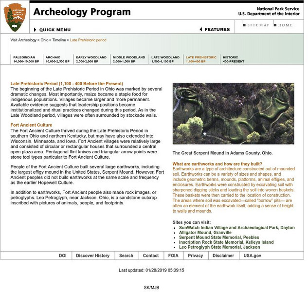 National Park Service gives a brief description of the late Prehistoric period in Ohio, and focuses on the Fort Ancient Culture that was responsible for building the Serpent Mound.