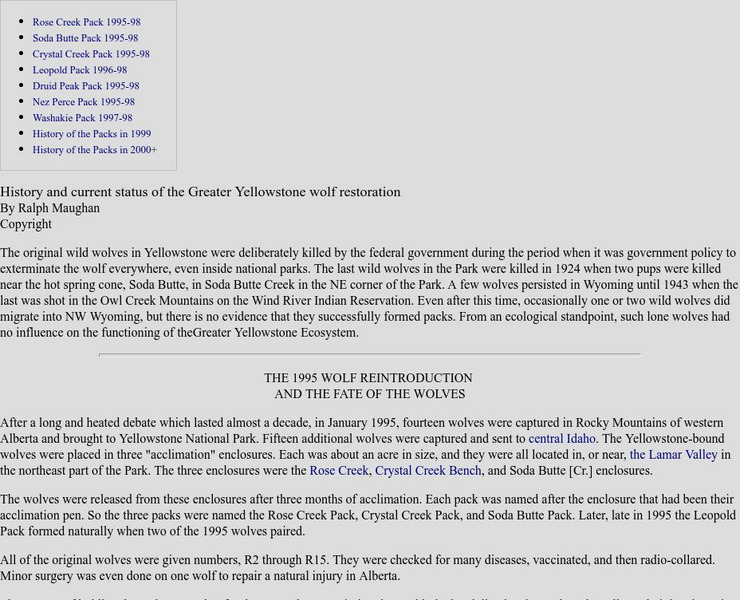 This report, written by the president of the Wolf Recovery Program, records the history and current status of the wolf packs of Yellowstone National Park. The report tracks individual members of the packs and shows what happened to each...