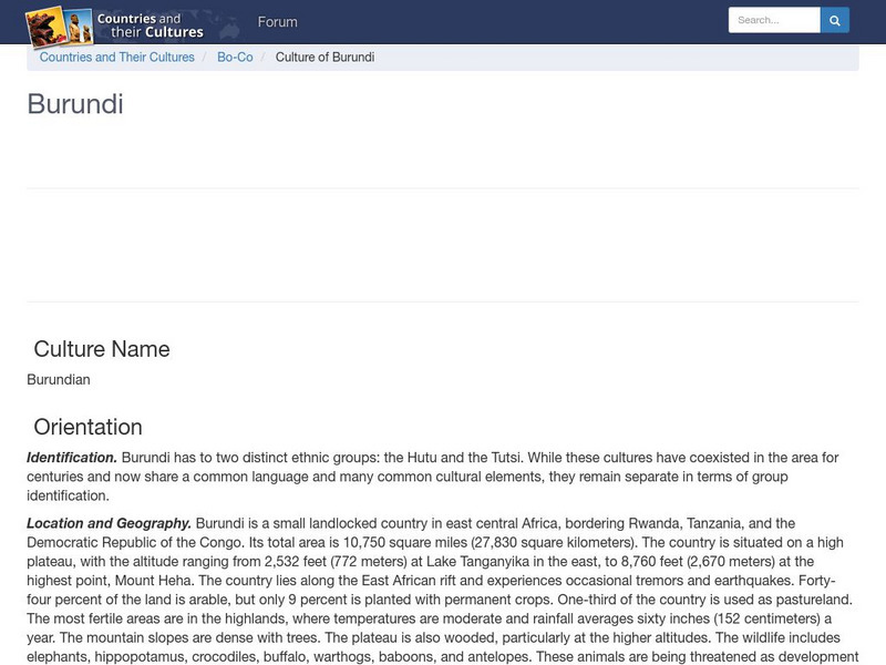Provides an overview of the culture of Burundi. Gives basic information on topics such as geography, ethnic makeup, languages, symbolism, economy, food, customs, social stratification, family life, education, religion, politics, etc....