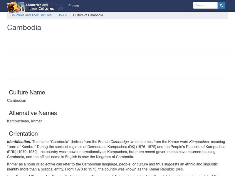 Provides an overview of the culture of Cambodia. Gives basic information on topics such as geography, ethnic makeup, languages, symbolism, economy, food, customs, social stratification, family life, education, religion, politics, etc....
