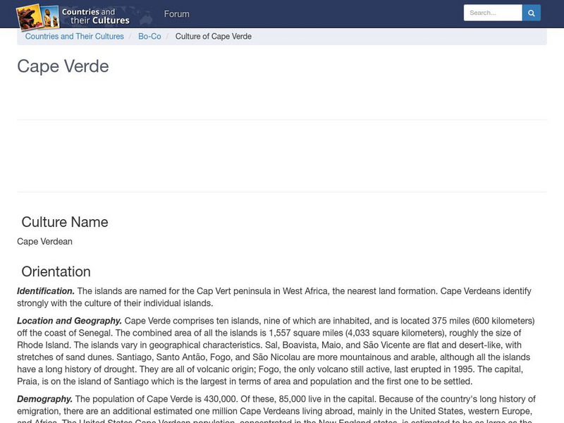 Provides an overview of the culture of Cape Verde. Gives basic information on topics such as geography, ethnic makeup, languages, symbolism, economy, food, customs, social stratification, family life, education, religion, politics, etc....
