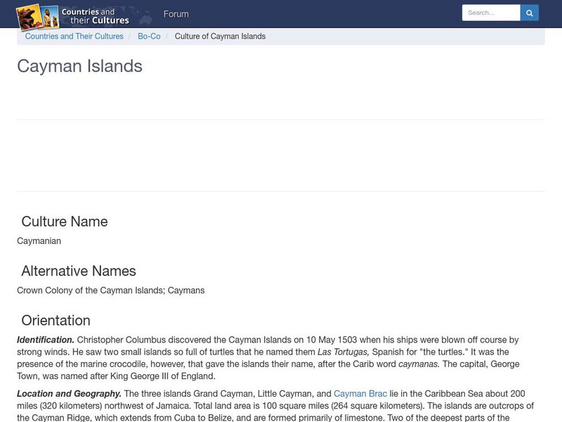 Provides an overview of the culture of the Cayman Islands. Gives basic information on topics such as geography, ethnic makeup, languages, symbolism, economy, food, customs, social stratification, family life, education, religion,...