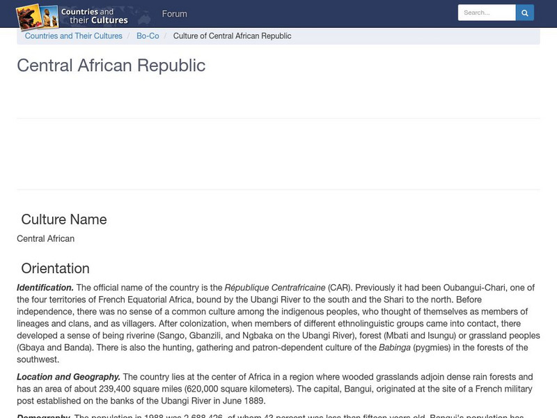 Provides an overview of the culture of the Central African Republic. Gives basic information on topics such as geography, ethnic makeup, languages, symbolism, economy, food, customs, social stratification, family life, education,...