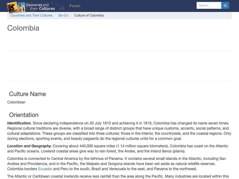 Provides an overview of the culture of Colombia. Gives basic information on topics such as geography, ethnic makeup, languages, symbolism, economy, food, customs, social stratification, family life, education, religion, politics, etc....