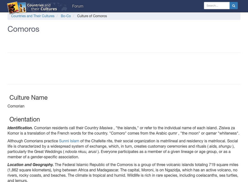 Provides an overview of the culture of Comoros. Gives basic information on topics such as geography, ethnic makeup, languages, symbolism, economy, food, customs, social stratification, family life, education, religion, politics, etc....