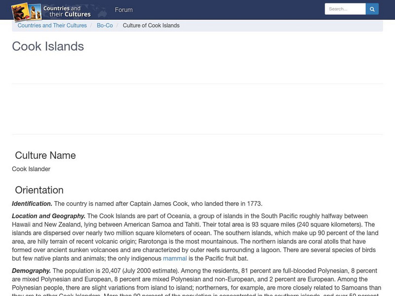 Provides an overview of the culture of the Cook Islands. Gives basic information on topics such as geography, ethnic makeup, languages, symbolism, economy, food, customs, social stratification, family life, education, religion, politics,...