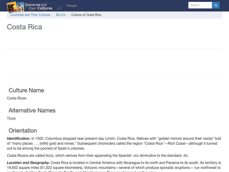 Provides an overview of the culture of Costa Rica. Gives basic information on topics such as geography, ethnic makeup, languages, symbolism, economy, food, customs, social stratification, family life, education, religion, politics, etc....