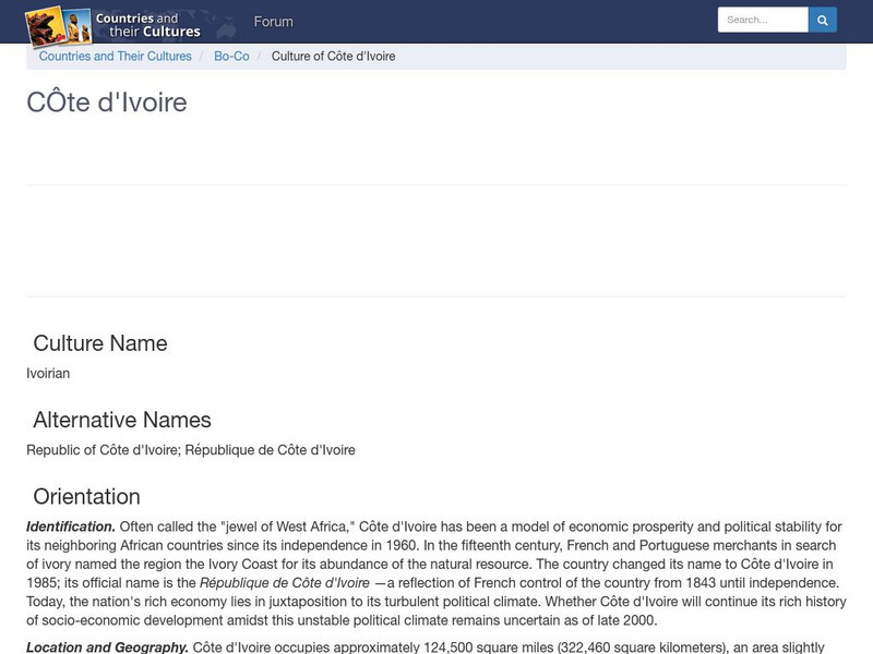 Provides an overview of the culture of Cote d'Ivoire. Gives basic information on topics such as geography, ethnic makeup, languages, symbolism, economy, food, customs, social stratification, family life, education, religion, politics,...