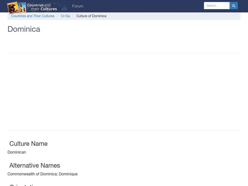 Provides an overview of the culture of Dominica. Gives basic information on topics such as geography, ethnic makeup, languages, symbolism, economy, food, customs, social stratification, family life, education, religion, politics, etc....