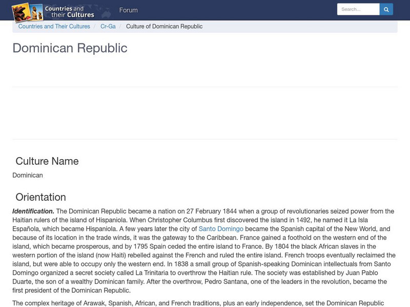 Provides an overview of the culture of the Dominican Republic. Gives basic information on topics such as geography, ethnic makeup, languages, symbolism, economy, food, customs, social stratification, family life, education, religion,...