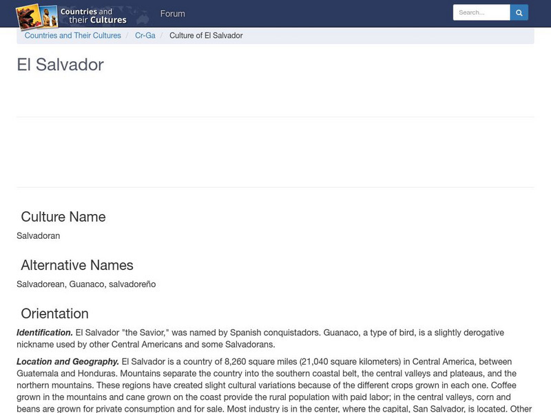 Provides an overview of the culture of El Salvador. Gives basic information on topics such as geography, ethnic makeup, languages, symbolism, economy, food, customs, social stratification, family life, education, religion, politics, etc....