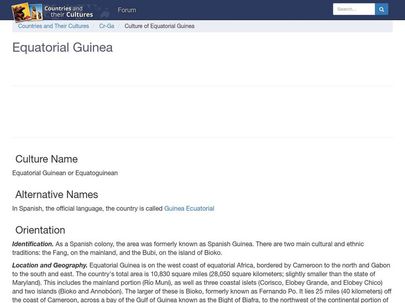 Provides an overview of the culture of Equatorial Guinea. Gives basic information on topics such as geography, ethnic makeup, languages, symbolism, economy, food, customs, social stratification, family life, education, religion,...