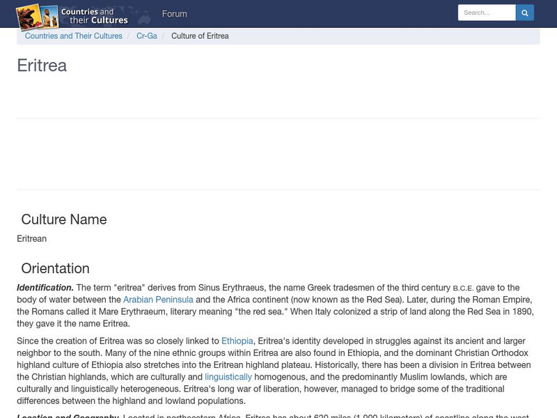 Provides an overview of the culture of Eritrea. Gives basic information on topics such as geography, ethnic makeup, languages, symbolism, economy, food, customs, social stratification, family life, education, religion, politics, etc....