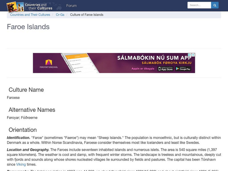 Provides an overview of the culture of the Faroe Islands. Gives basic information on topics such as geography, ethnic makeup, languages, symbolism, economy, food, customs, social stratification, family life, education, religion,...