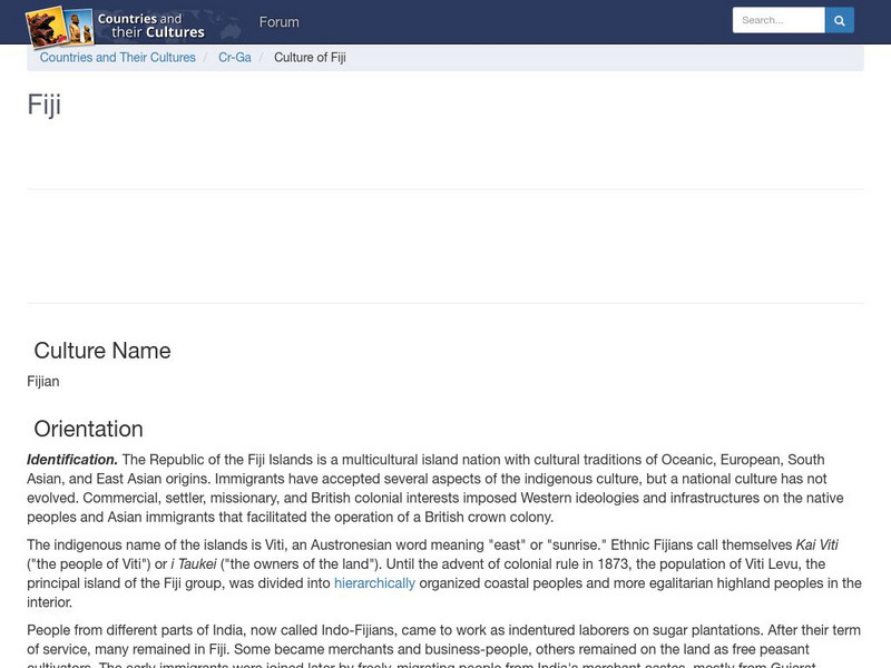 Provides an overview of the culture of Fiji. Gives basic information on topics such as geography, ethnic makeup, languages, symbolism, economy, food, customs, social stratification, family life, education, religion, politics, etc. (Note:...