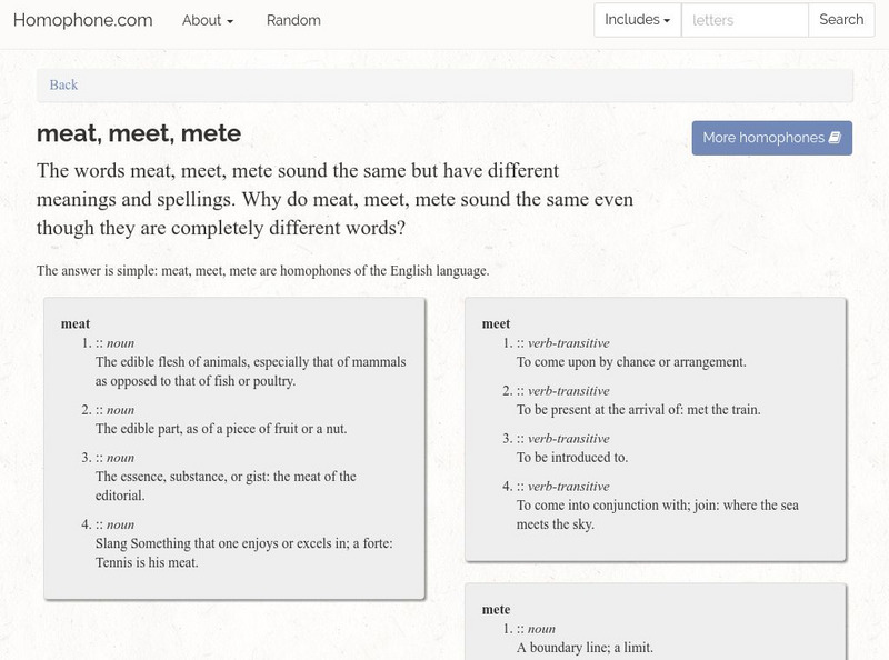 This short reference page provides clarification for the homophones meat, meet, and mete. The basic definition of the word homophone is also provided.