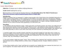 Students explore bullying. For this character development lesson, students discuss verbal and nonverbal bullying. Using the "sticks and stones" adage, students write a sentence describing a hurtful act on a gray piece of paper,...