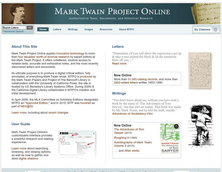 Access to many of Mark Twain's letters and writings. You can click on "biographies" to read about people mentioned in Twain's writings. Use the user's guide to navigate the site.