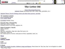 Students explore the concept of the letter Dd. In this letter recognition lesson, students are engulfed with items, movement, and music that begin with the letter Dd. Students create crafts that help them learn and recognize...