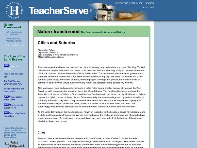 Essay on the history of cities and suburbs and how nature has been transformed in the U.S. Author Christopher Sellers guides us with informational text, questions and scholars debate.