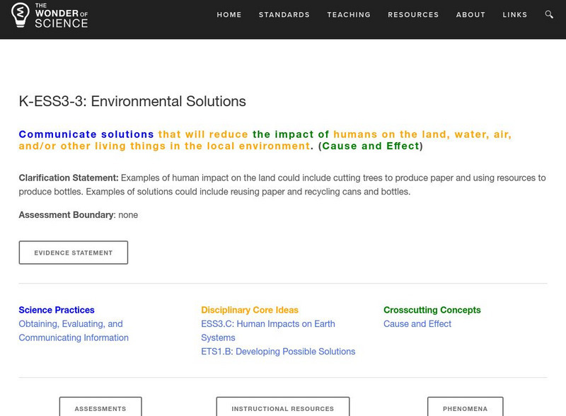 This NSTA vetted source includes resources to teach ideas on reducing the impact of humans on the environment. Included are assessment ideas, videos, examples, lesson plans, and photos of student work.