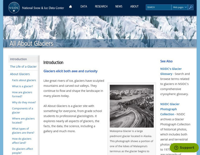 Extensive information about glaciers. Tells about the life of a glacier, how they form, how they impact the surrounding areas, and what happens when glaciers stop growing. Includes a photo gallery, and links to scientific research on...