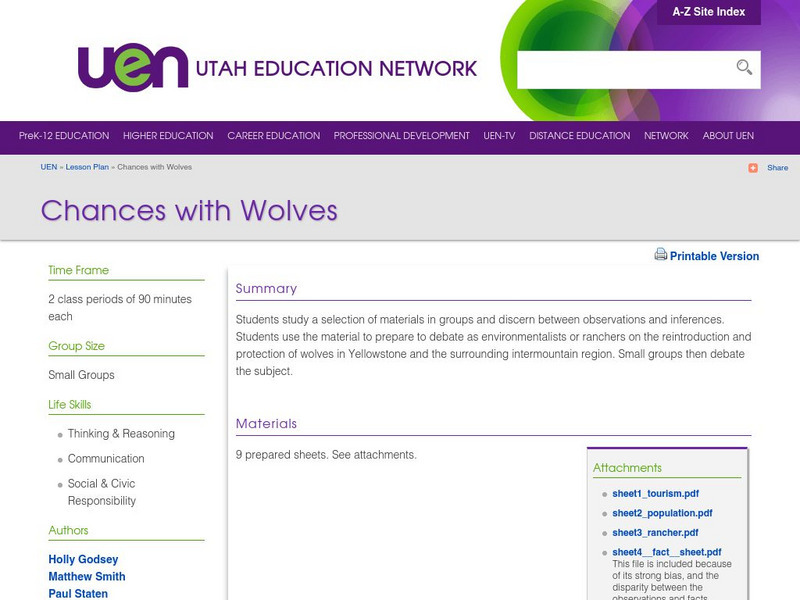 This lesson engages students in learning the differences among observations, facts, and inferences. Students will study about the reintroduction of wolves into the Rocky Mountain and Yellowstone Region. Students will work in small groups...