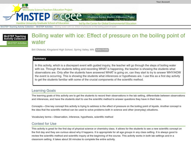 In this activity, which is a discrepant event with guided inquiry, the teacher will go through the steps of boiling water with ice. Through the students telling and recording WHAT is happening, the teacher is showing the students what...