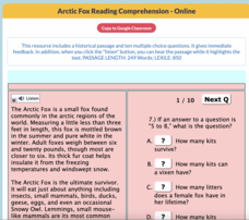 A short informative text shares details about the Arctic Fox. Scholars read or listen to the text then answer 10 multiple-choice questions.
