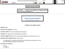 Eighth graders discover how animals adapt to their surroundings. They identify physical traits and behaviors that are important to survival. They examine the results of an organism's failure to adapt.