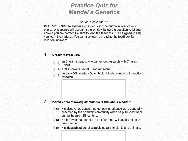 This site from Palomar College provides an online practice quiz includes history as well as some of the genetics. Includes feedback. A great learning and practice site.