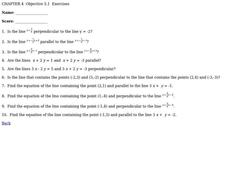 In this equation of a line worksheet, 10th graders solve ten problems that determine locating the equation of a line. They first determine whether the given lines are perpendicular or parallel. Then students find the equation of the line...