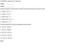 For this linear equations worksheet, students solve ten problems. The first five, they find the equation of the line that contains the given point and has the given slope. Then, for the last five, students find the equation containing...