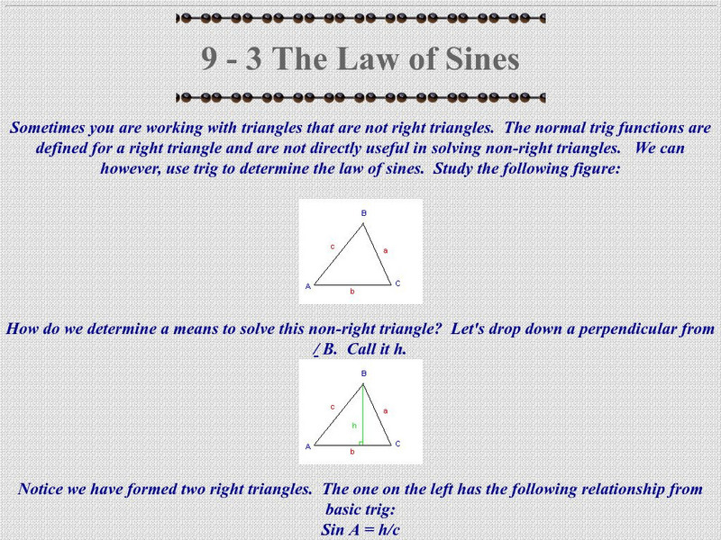 An introduction to solving acute and obtuse triangles by using the law of sines, including a derivation of the formula. Includes several pictures and examples.