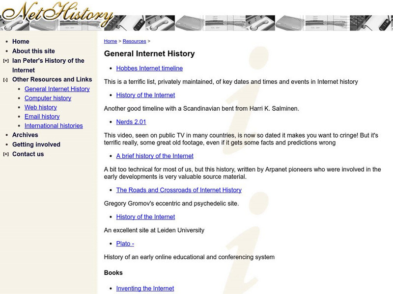 Substantial list of Internet history resources for the beginner to the techy. The descriptive list includes links to EBooks, timelines, video clips and reference material. The referenced sites come from a variety of organizations and...