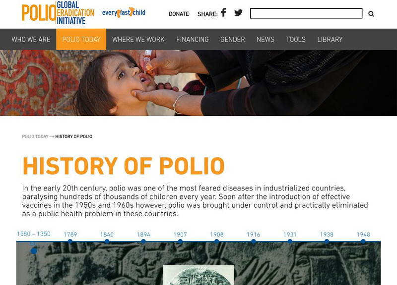 This timeline from Global Polio Eradication Initiative of pictures, descriptions, and events -- all of which describe the history of polio and its vaccine -- is organized into three large sections: "Endemic Polio 1580BC-1953," "Vaccine...