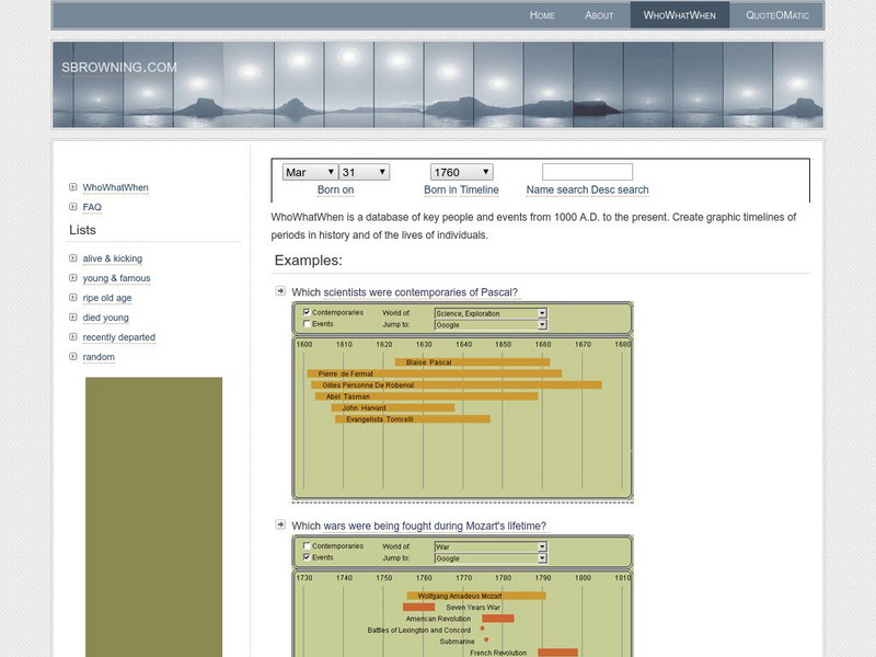 Use this site to learn about specific dates in history at this interactive timeline. Enter dates and years to retrieve charts showing famous births, deaths, and inventions. Here, you can also create graphic timelines of events and...