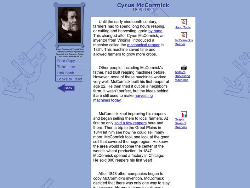 Easy to read brief biography of the man who invented the mechanical reaper, Cyrus McCormick (1808-1884). View a timeline and see pictures of the reaper and other harvesting machines.