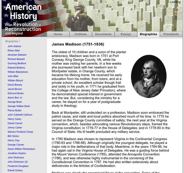 This easy-to-navigate site has James Madison's biography, significant events in his life, an image gallery, and several video clips.