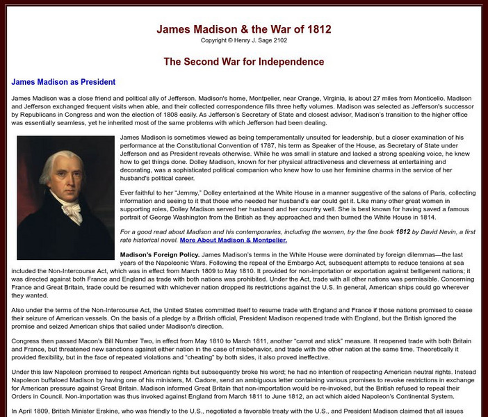 Article on James Madison's presidency including comprehensive material on the War of 1812.