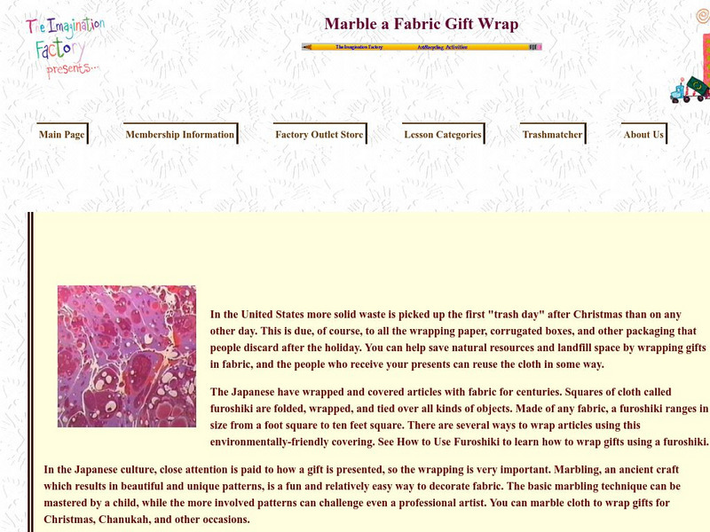 Create your own gift wrap using this art activity. This website provides detailed instruction for making "marbled" fabric and paper. Included is information for purchasing materials for marbling.