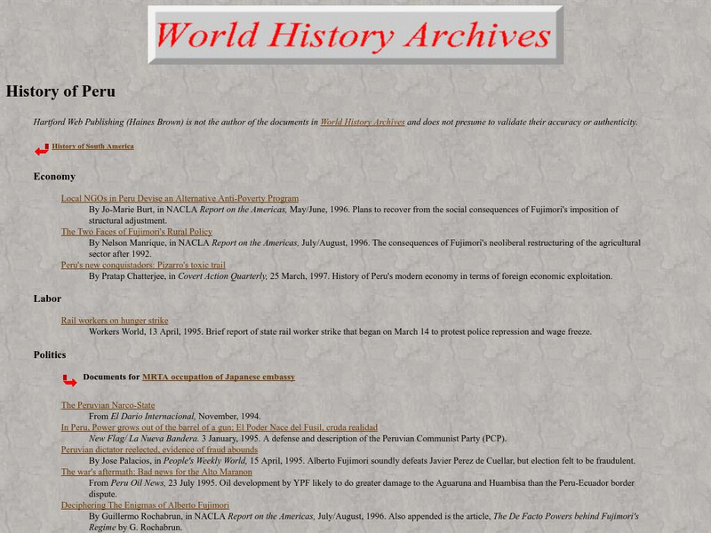 A collection of articles "from a working-class and non-Eurocentric perspective" about the history of Peru. The articles cover topics in economy, labor, politics, society, culture and telecommunications.