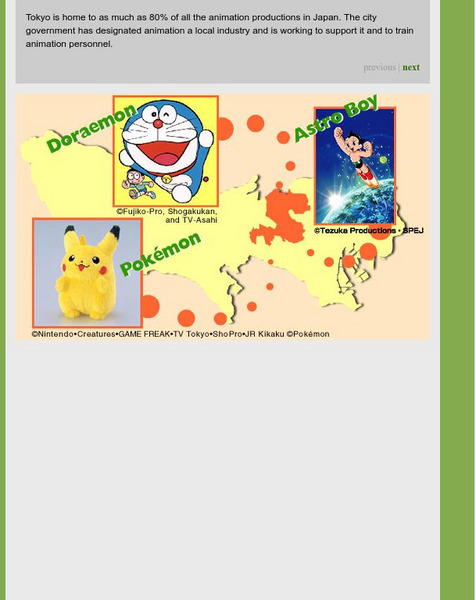 A short essay on the history of cartooning and animation in Japan. Discusses the importance of anime (also known as Japanimation) as an industry to Japan and its global reach. Nice samples of anime characters and styles frame the site.